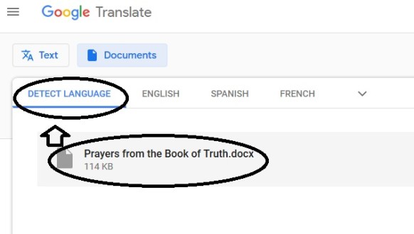 Step Three – Once you have uploaded the document, book, or booklet, it should look like the image below (see circle). Also, make sure it is left on the default “Detect Language” (see arrow).