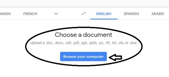 Step Two – Click on the “Browse your computer” blue button and upload the already saved document, book, or booklet from your computer to Google Translate (see circle).