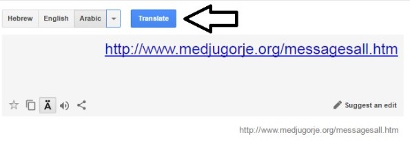 Step Three – Click on the blue button that says “Translate” (see arrow). Google Translator will instantly translate the website for Our Lady of Medjugorje into your language.