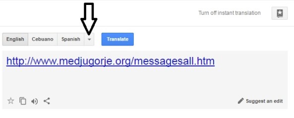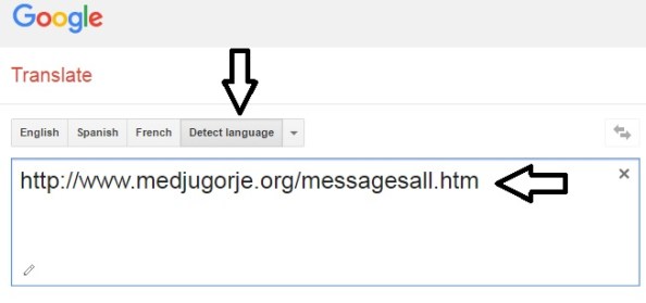 Step One – Type this internet address for Our Lady of Medjugorje – http://www.medjugorje.org/messagesall.htm into the blank rectangular box (see arrow). Make sure it is left on the default “Detect Language” (see arrow).