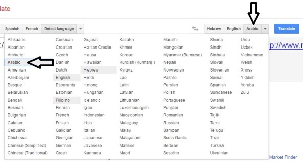 Step Two – Choose the language that you want the website to be translated into. Click on the small upside down triangle to see more language choices. Follow the arrows in the two pictures below.